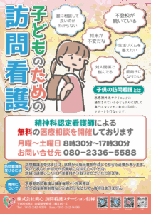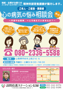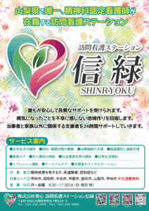 山梨県で唯一、精神科認定看護師が在籍する訪問看護ステーション信緑がオープンしました。 誰もが安心して良質なサポートを受けられます。 病気になったことを不幸に感じさせない地域作りを目指します。 当事者と家族以外に関係する支 […]